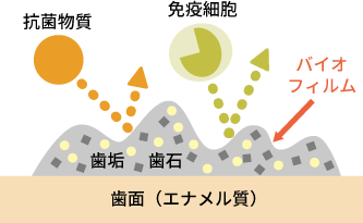 口腔内にはバイオフィルムというネバネバした物質で、頑固に結びついている細菌の塊があります。